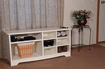 4302SW Features: -Half cubby bench. -Special walnut finish. -Stained solid oak veneer construction. -Six large cubbies. -One adjustable shelf. -Cubbies and shelf be placed on either side. -Sturdy design. -0.25'' Back to add stability. -Rails on top to support an optional cushion (not included). -Large cubbies fit most pairs of shoes so no need to try and stack them in. -It is also a great piece for any type of organization around the house. -The rear of the bench is unfinished. -It is a very durable bench. Specifications: -Made in USA. -Assembly required. -Main supporting parts dimension: 0.75''. -Cubby dimensions: 5'' H x 9.75'' W. -Overall dimensions: 24'' H x 45'' W x 15'' D.