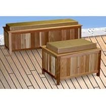 Made of weather-resistant cedar the Outdoor Storage Bench easily holds garden tools buckets or pool supplies. The box offers a deep space to store cushions balls and bulky items. It can also serve as a side table for outdoor entertaining. The bench offers a nice combination of accessible storage and cushioned seating. Please note: Bench is suitable for indoor or outdoor use in a protected area. Bench should not be left directly exposed to the elements. . Made in America